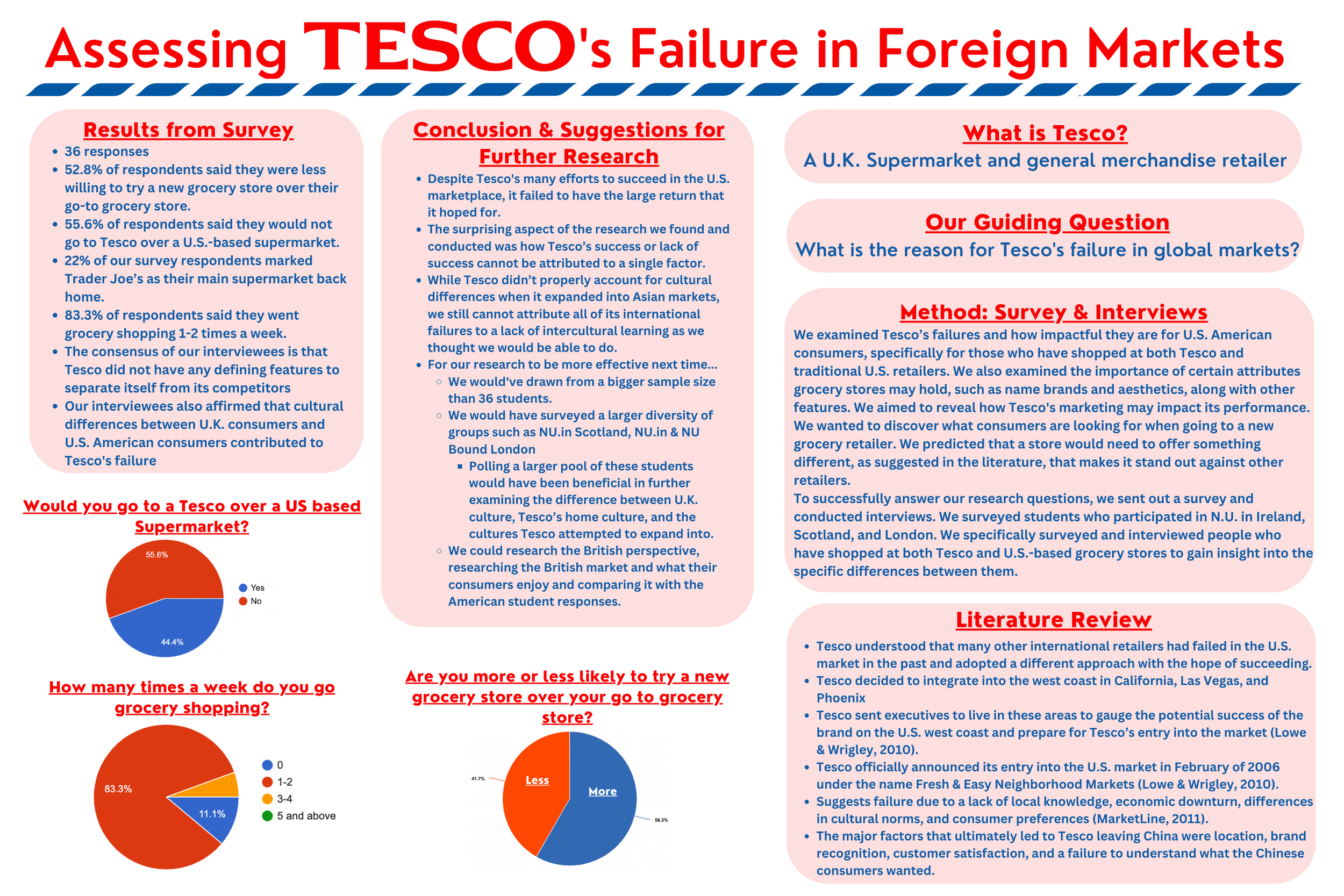 A literature review and visual presentation analyzing the reasons why Tesco failed globally, but thrives in the UK and Ireland. We also conducted primary research interviewing students who had experienced Tesco. We asked them questions about their grocery store preferences and U.S. cultural values to determine possible reasons for its U.S. Failure.
