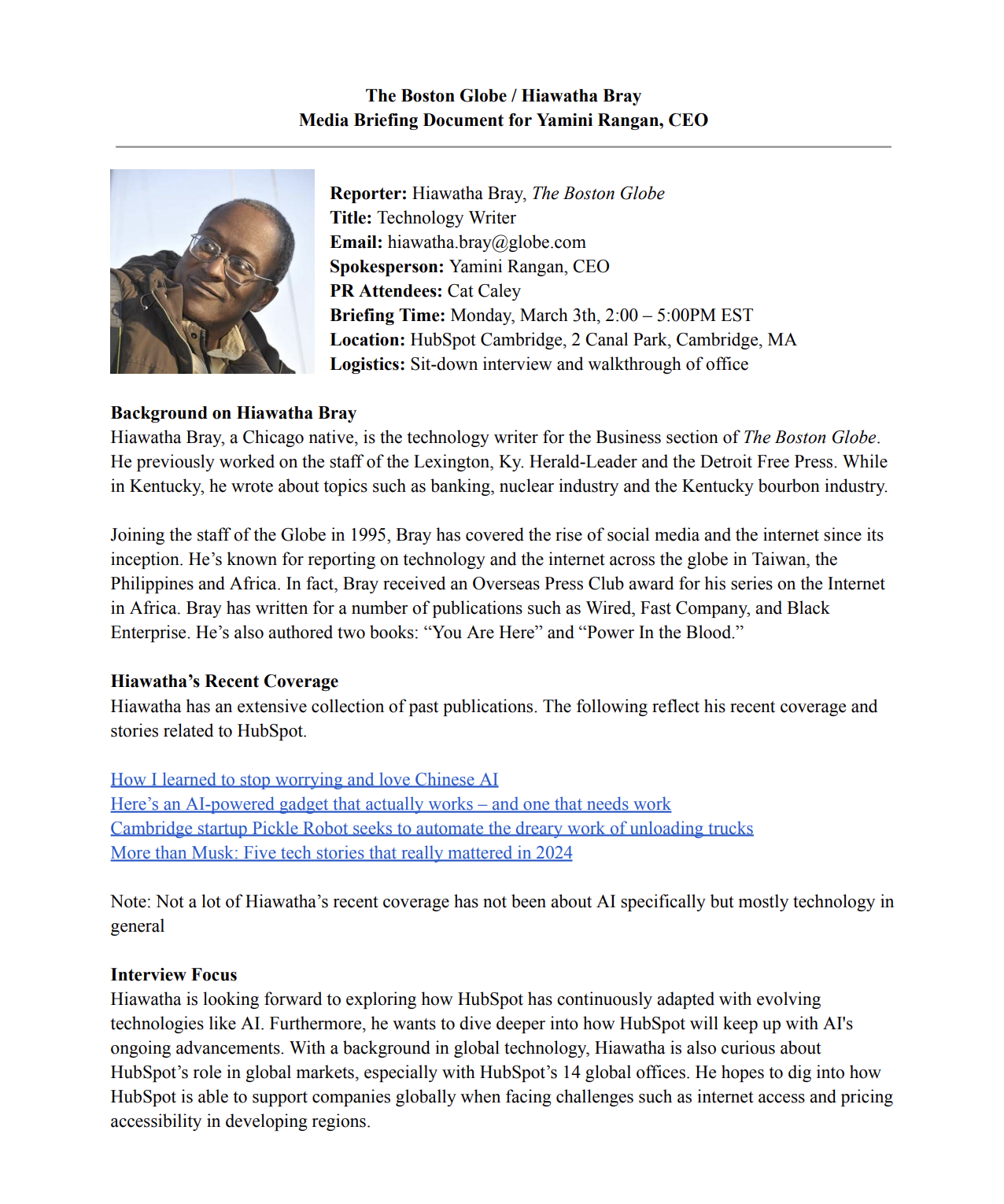 Developed a media pitch and executive briefing book for HubSpot targeting a veteran Boston Globe tech journalist. Crafted a compelling story pitch highlighting HubSpot's value and future prospects, then built out a full briefing book to prepare the CEO for the interview — including journalist background research, recent coverage analysis, recommended talking points, key messages, and anticipated questions.
